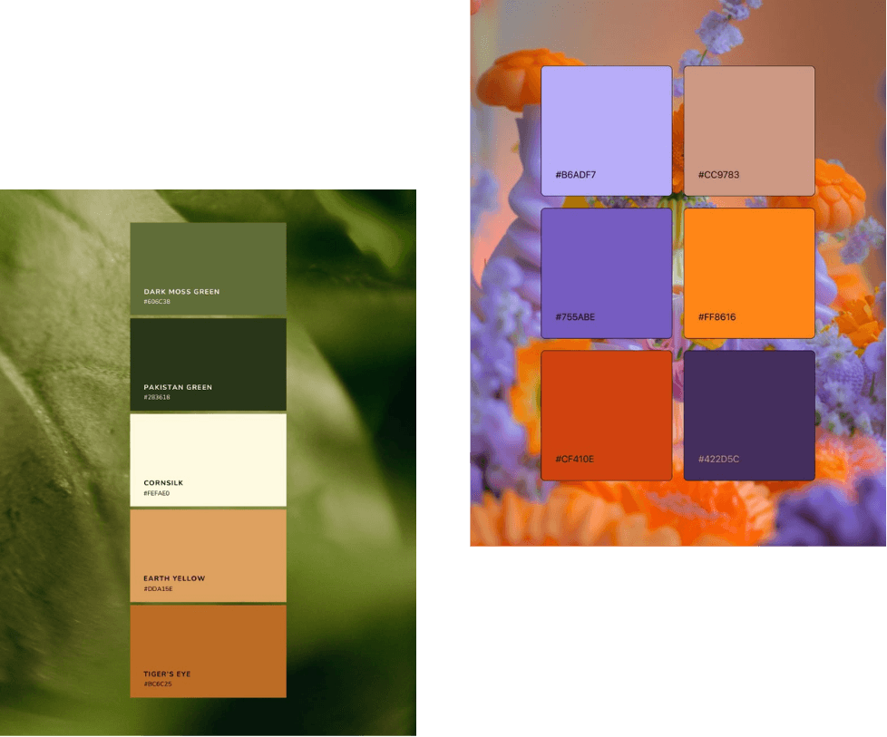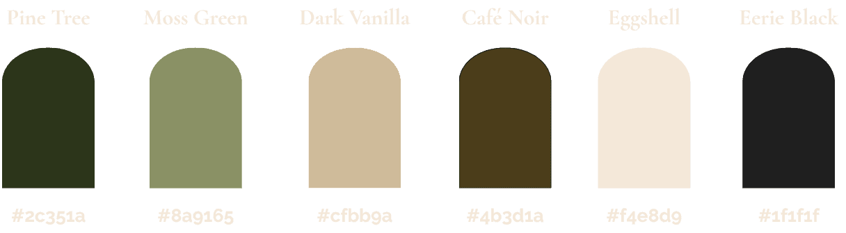 For the color palette, it consists of earthy tones such as Pine Tree and Moss Green for the natural elements, Dark Vanilla and Eggshell for a warm, aged, and classic background feel, Café Noir and Eerie Black for contrast and body text, ensuring sophistication and readability. This scheme perfectly embodies the concept of a rich cultural journey.