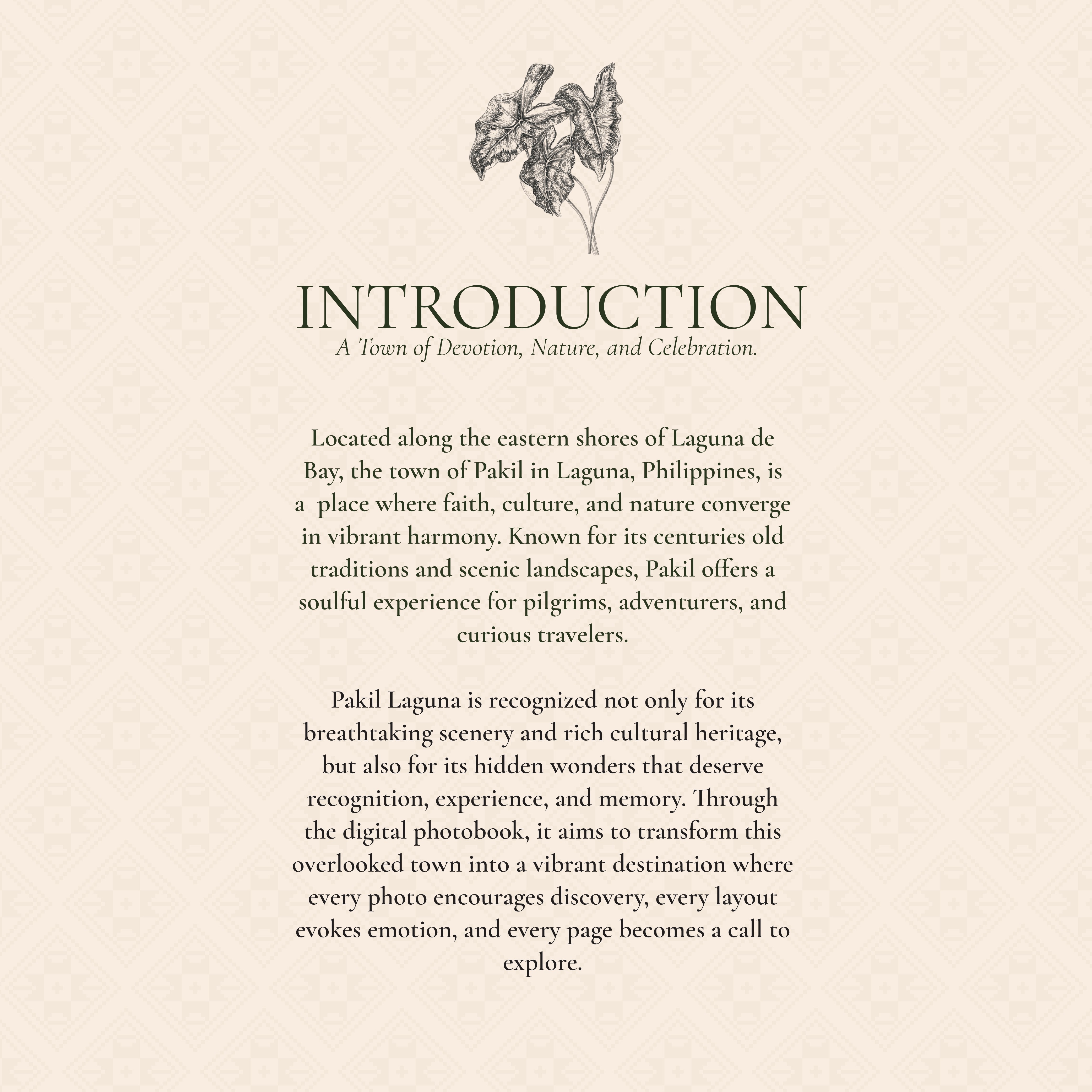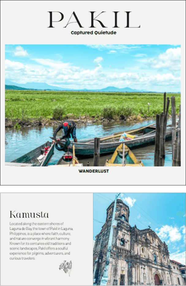 To utilize color theory, elements and principles of design, typography, and layout design that will resonate Pakil’s charm within the digital photobook.