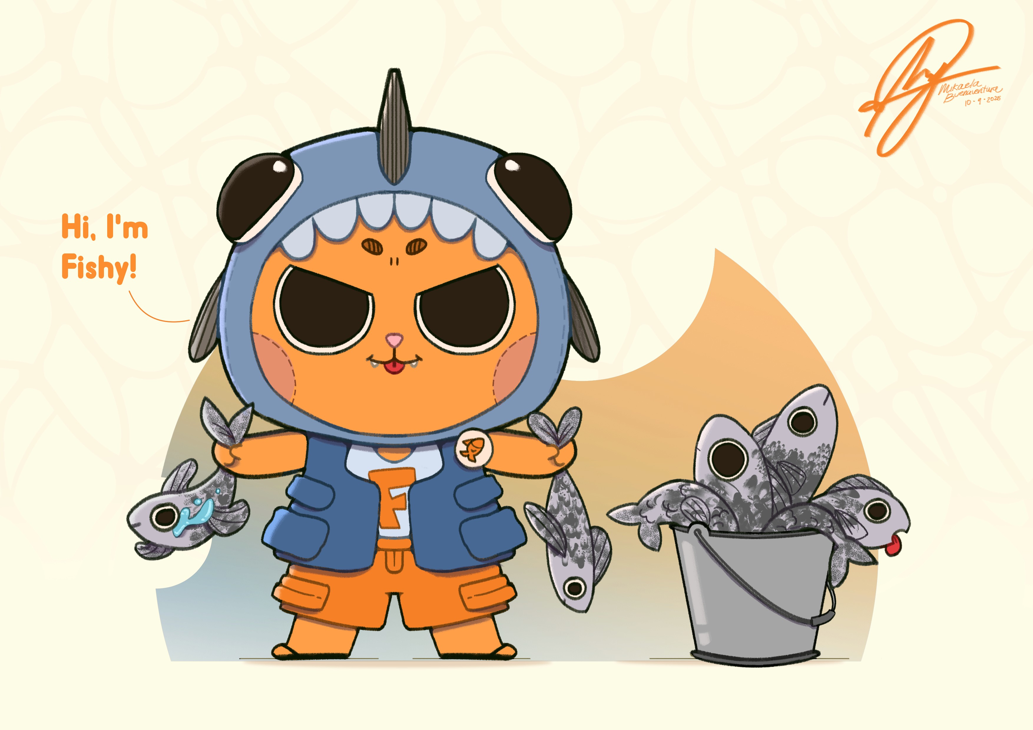 Fishy's design is inspired by the aquaculture farms in Pangasinan. He was made a cat because, aside from bears, which are not native to the Philippines, the next animal that comes to mind that loves fish is the Cat. His color scheme is a mix of blues and oranges, reflecting the branding of Fisherfarms, as well as the symbolism of excitement, hunger, and the waters. The 'F' in his shirt can mean a lot of things: Fisherfarms, Fishy, or fish itself. The purpose of this is to make Fishy tied to the branding of Fisherfarms. He wears a custom hood instead of a traditional hat to showcase his love for fish.