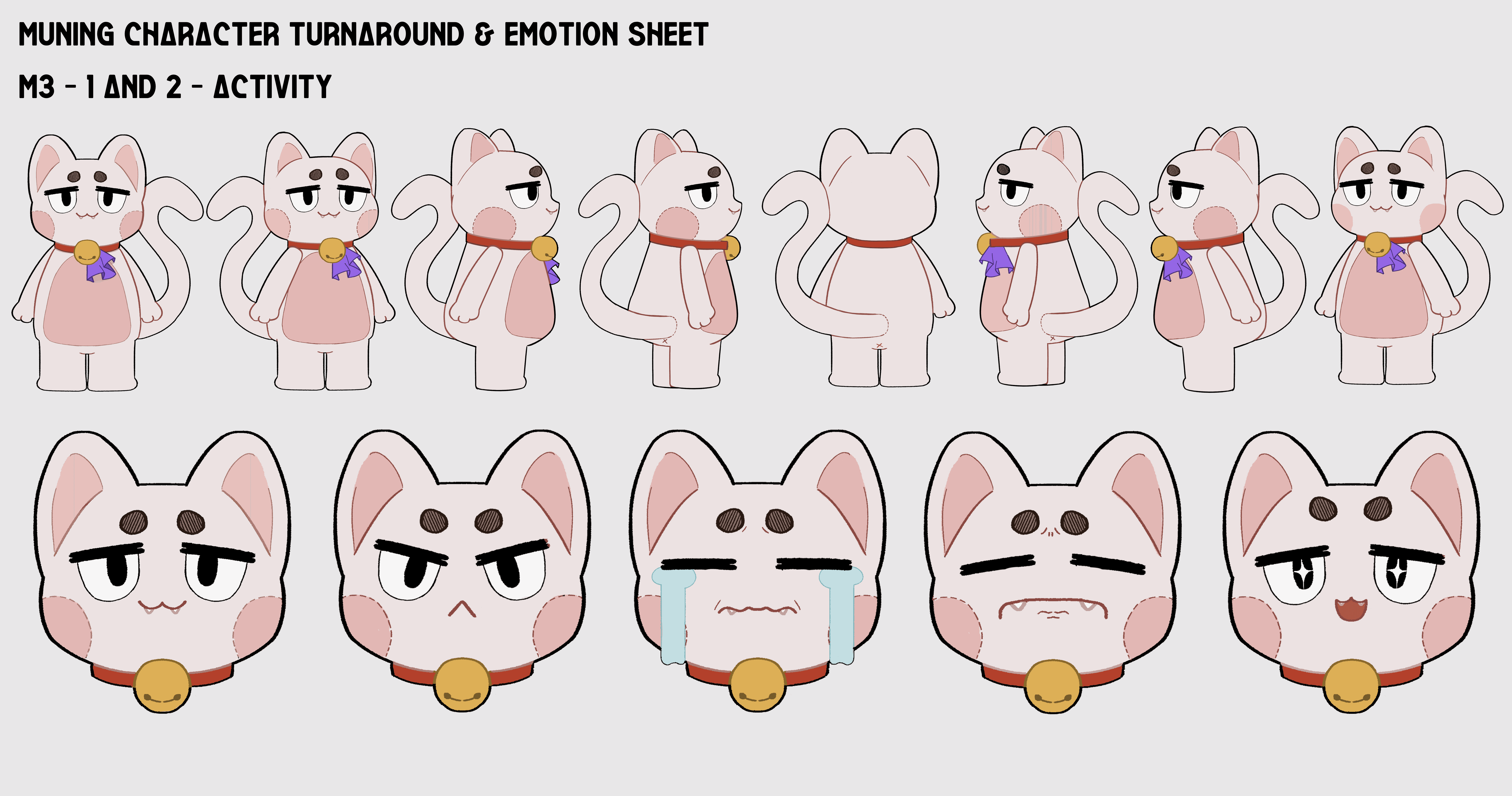 I also created a turnaround character sheet with emotion samples to portray Muning's personality better.