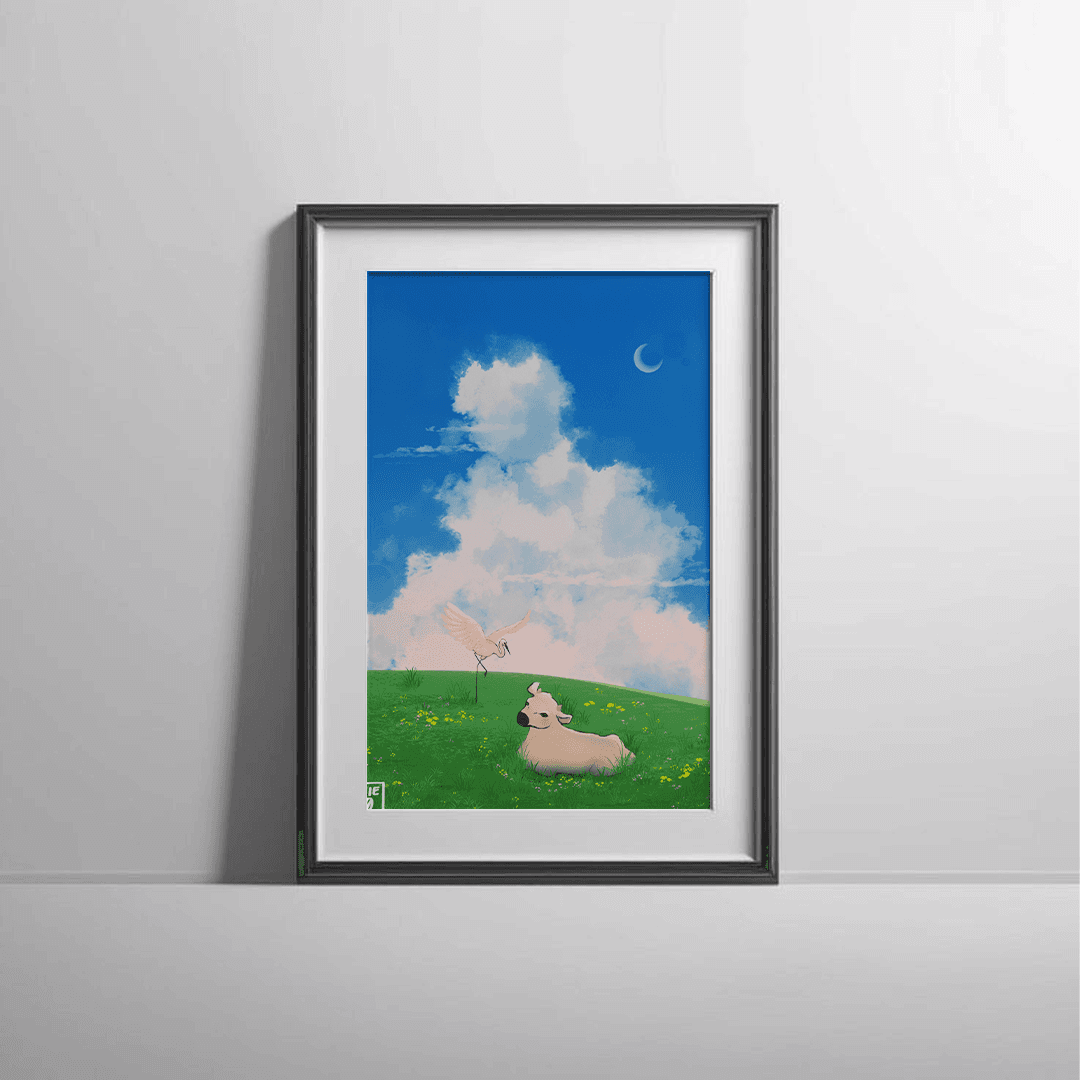 In early 2025, while traveling through the countryside, I spotted a charming scene in a serene field; a cow and a crane resting side by side. The contrast between their forms piqued my interest, inspiring me to consider capturing this unexpected harmony on paper.